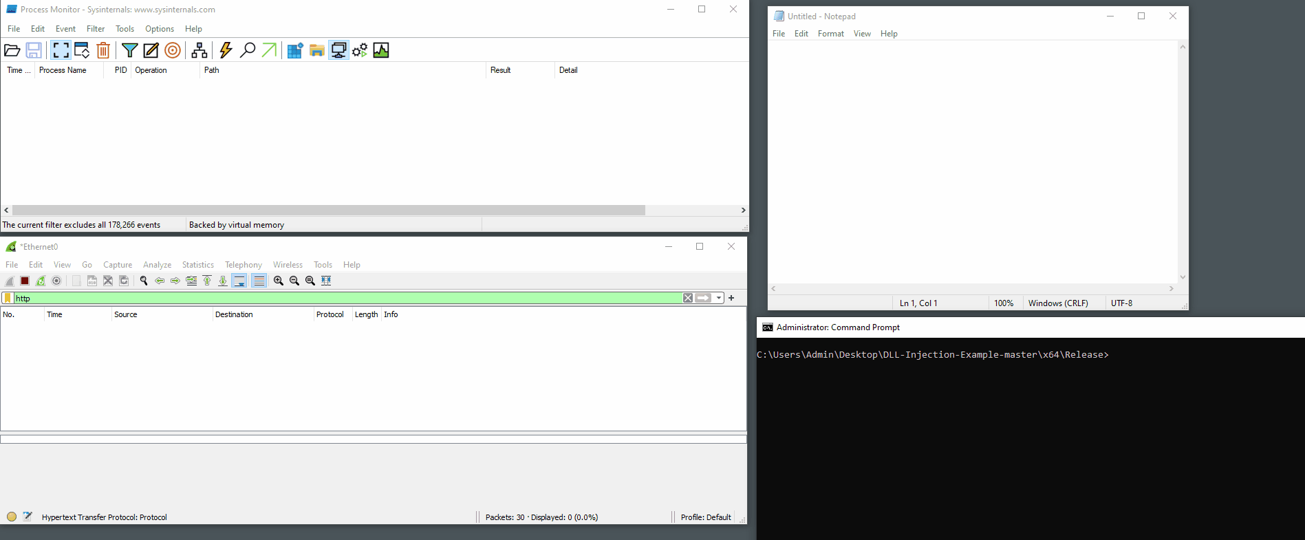 The following GIF provides a video demonstration of the injection process. When the DLL Injector is executed we can see HTTP traffic begin in the Wireshark window. At the same time, we can see in Process Monitor the process responsible for this traffic is Notepad.