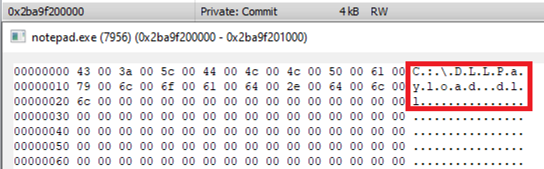 Digging deeper, in Process Hacker we can see the buffer allocated to store the DLL payload path inside of Notepad.